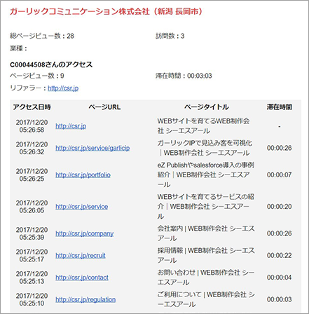 閲覧したページ数が多い順に並んでいるので、上位に表示されている企業ほど、熱心に貴社サイトを閲覧した企業のため、見込み度の高い企業と言えます。