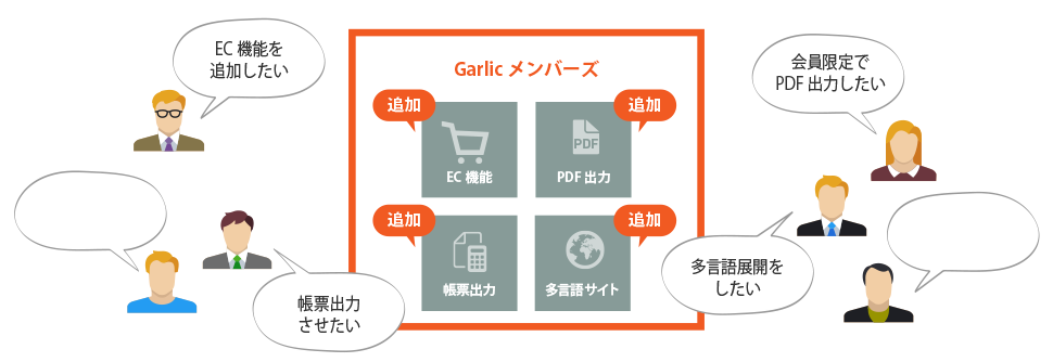 Garlicメンバーズは単純なパッケージ管理ではないため、企業のニーズにあわせて、自由にカスタマイズが可能です。