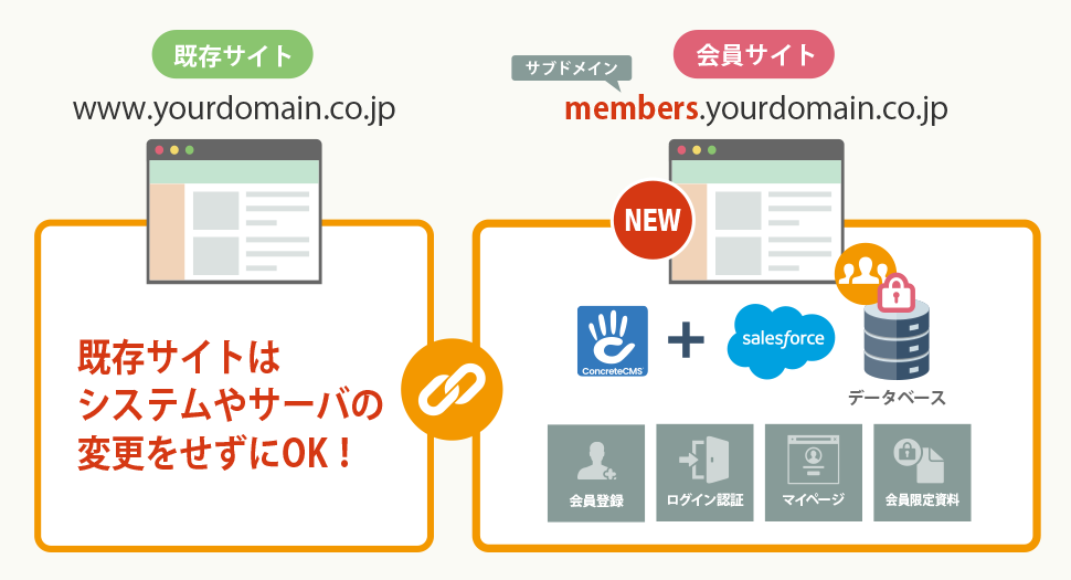 コンテンツ管理をConcreteCMS、会員情報管理をSalesforceで行います。