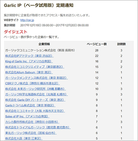 毎日送付されるWEBサイトにアクセスしている企業一覧を知らせる案内メール。